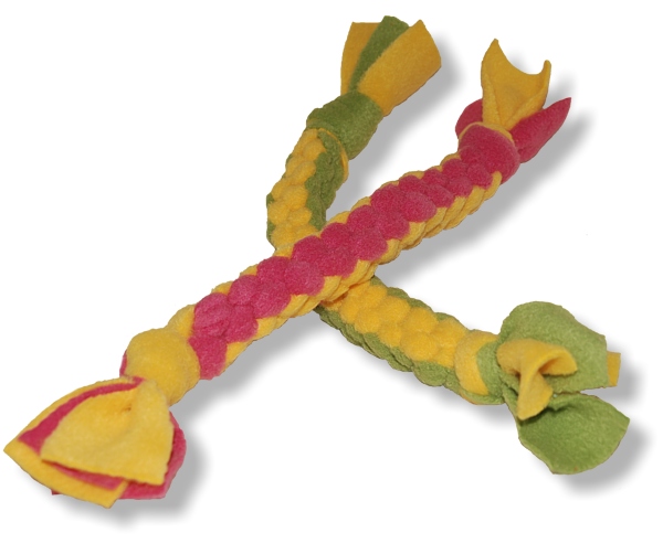 Fleecové tahadlo Gang Tug - Stick in Yellow jespletené z několika proužků a tak se nemůže rozpojit při hře. Jemný materiál bez jakýchkoli hrubých nebo ostrých částí je vynikající pro citlivější psy. Hračka je vyrobena ručně.