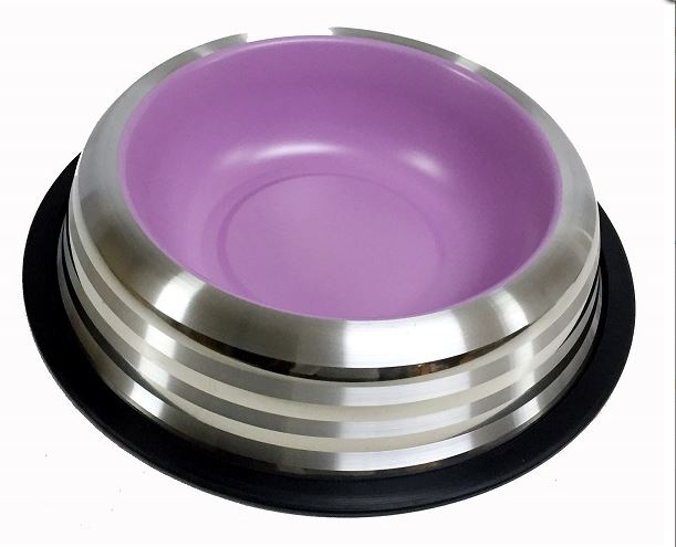Nerezová miska na vodu nebo jídlo. Vnitřek je opatřen eloxováním atraktivní barvou. Vnější obal má frézované proužky.