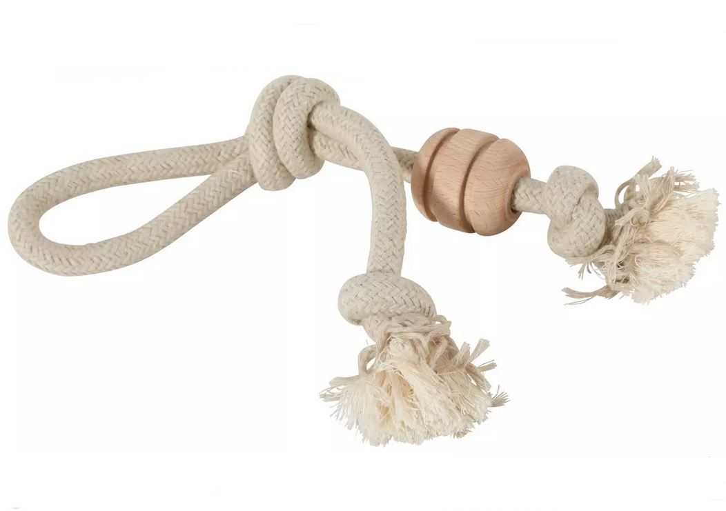 Hračka z přírodních materiálů: nebělený bavlněný provaz a bukové dřevo spojené do hračky na přatahování a také trochu toho pokousáníčka.