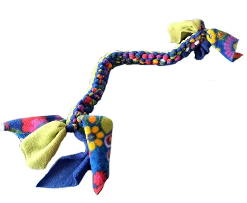 Fleecové tahadlo Gang Tug - Stick In Flowers jespletené ze čtyř proužků a tak se nemůže rozpojit při hře. Jemný materiál bez jakýchkoli hrubých nebo ostrých částí je vynikající pro citlivější psy. Hračka je vyrobena ručně. Na výrobu tahadla byl použit nový materiál.