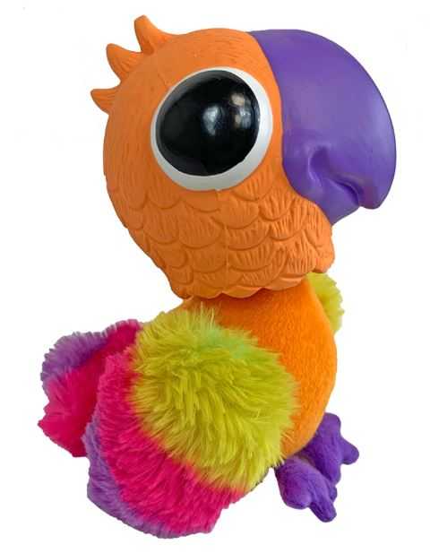 Hračka pro středně velké a větší psíky, která kombinuje přednosti plyšových a latexových hraček. Hlava o průměru 8 cm má výrazný zobák i kukadla. Tělíčko z jemného mikroplyše má na sobě křidýlka s duhovou kožešinou s delším vlasem.