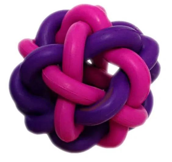 Míček je důvtipně spletený z gumových válečků fuchsiově růžové a fialové barvy.