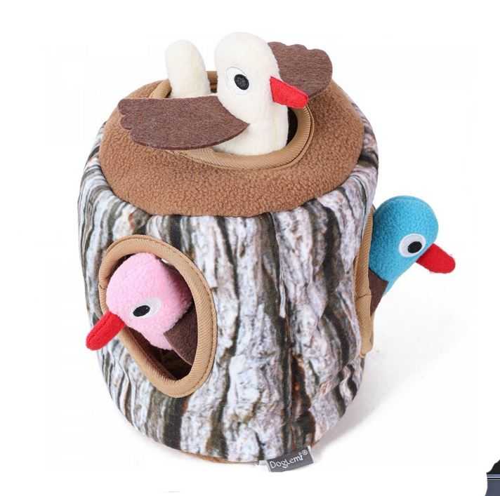 Tyto interaktivní hračky jistě vašeho psa zabaví. Ptáčci jsou v diře kmenu volně a tak se pes může skvěle zabavit při jejich vyhánění ven. Každý ptáček má v sobě pískátko pro ještě větší zábavu.