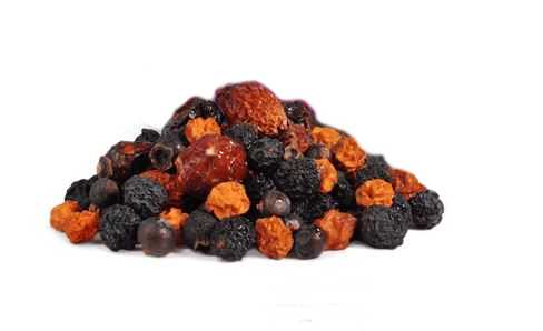 Najdeme v ní pět druhů divocerostoucích bobulí: sušené šípky, sušené jeřabiny, bobule aronie, bobule hlohu a jalovcové bobulky.